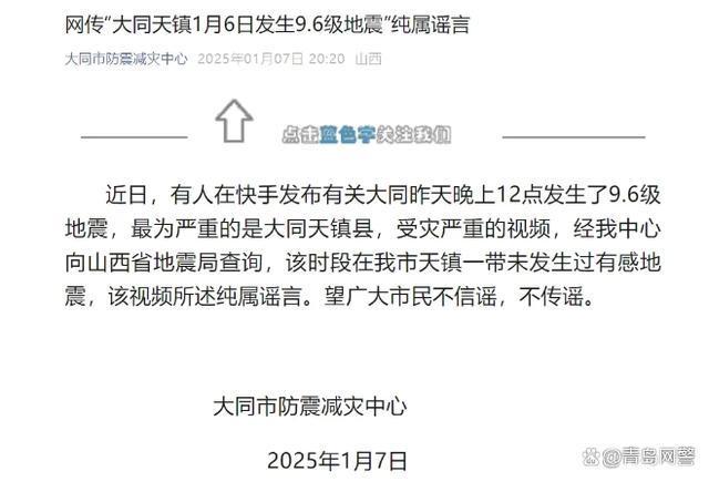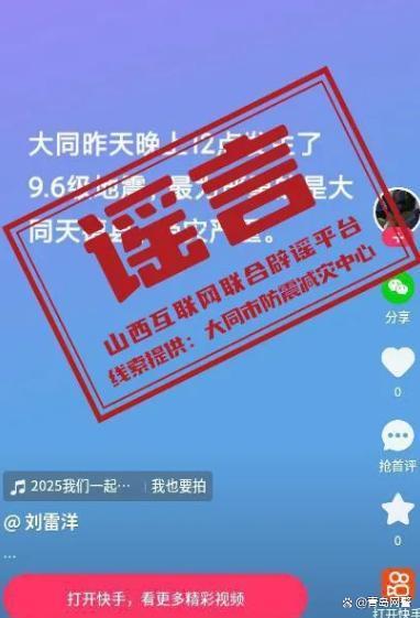 近日,有网民在短视频平台发视频称:“大同发生了9.6级地震,最为严重的是大同天镇县,受灾最严重”,相关部门发现该消息后,立即对相关线索展开核实。